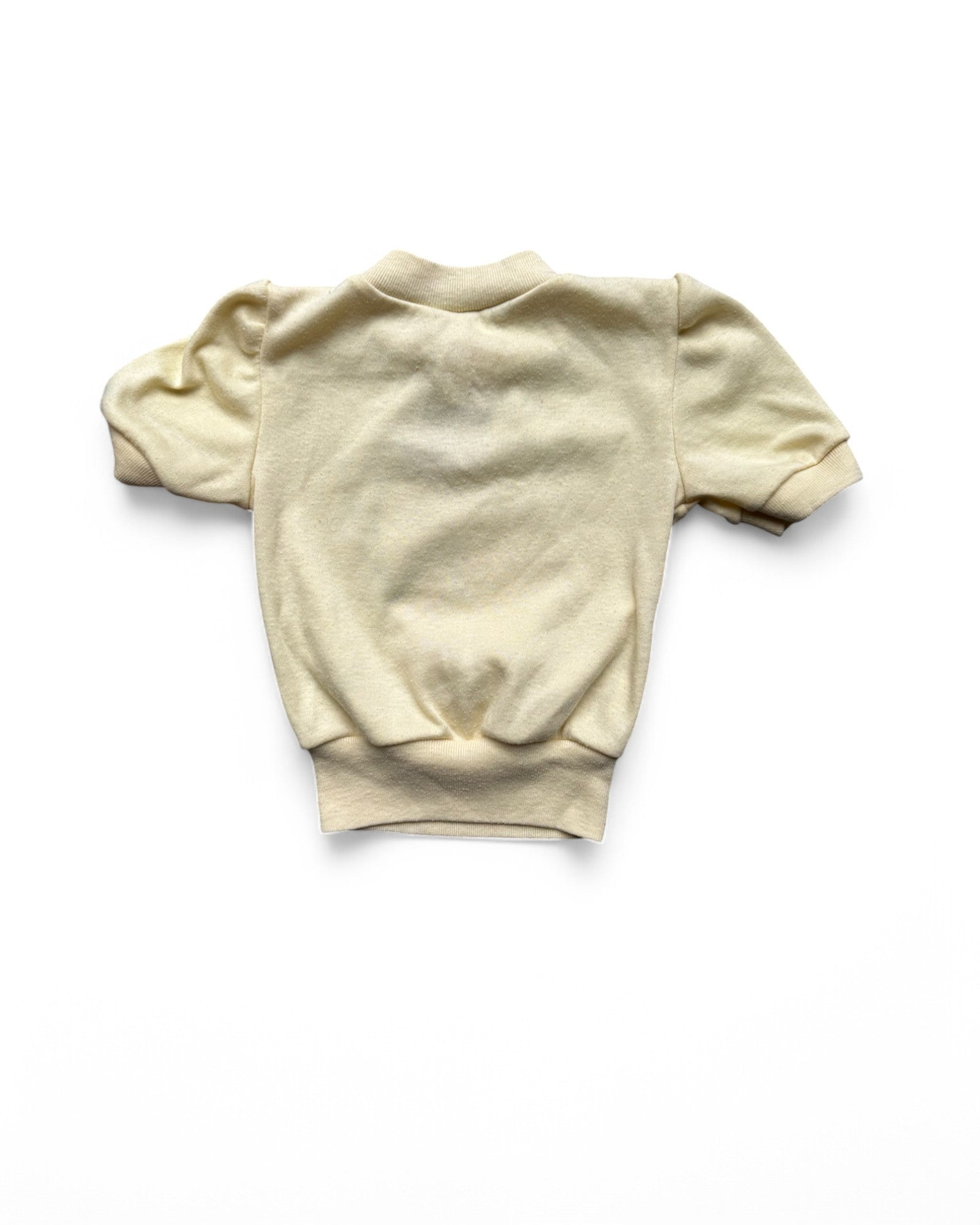 Get ready to spread some nostalgic cheer with this 80's vintage Care Bears yellow short sleeve sweatshirt! Featuring the beloved characters printed on the front, this sweatshirt is perfect for any Care Bears fan. Bring back those childhood memories and add a touch of playfulness to your kids wardrobe. Great vintage condition. Labelled size 4T but tiny so recommend 2-3yrs.