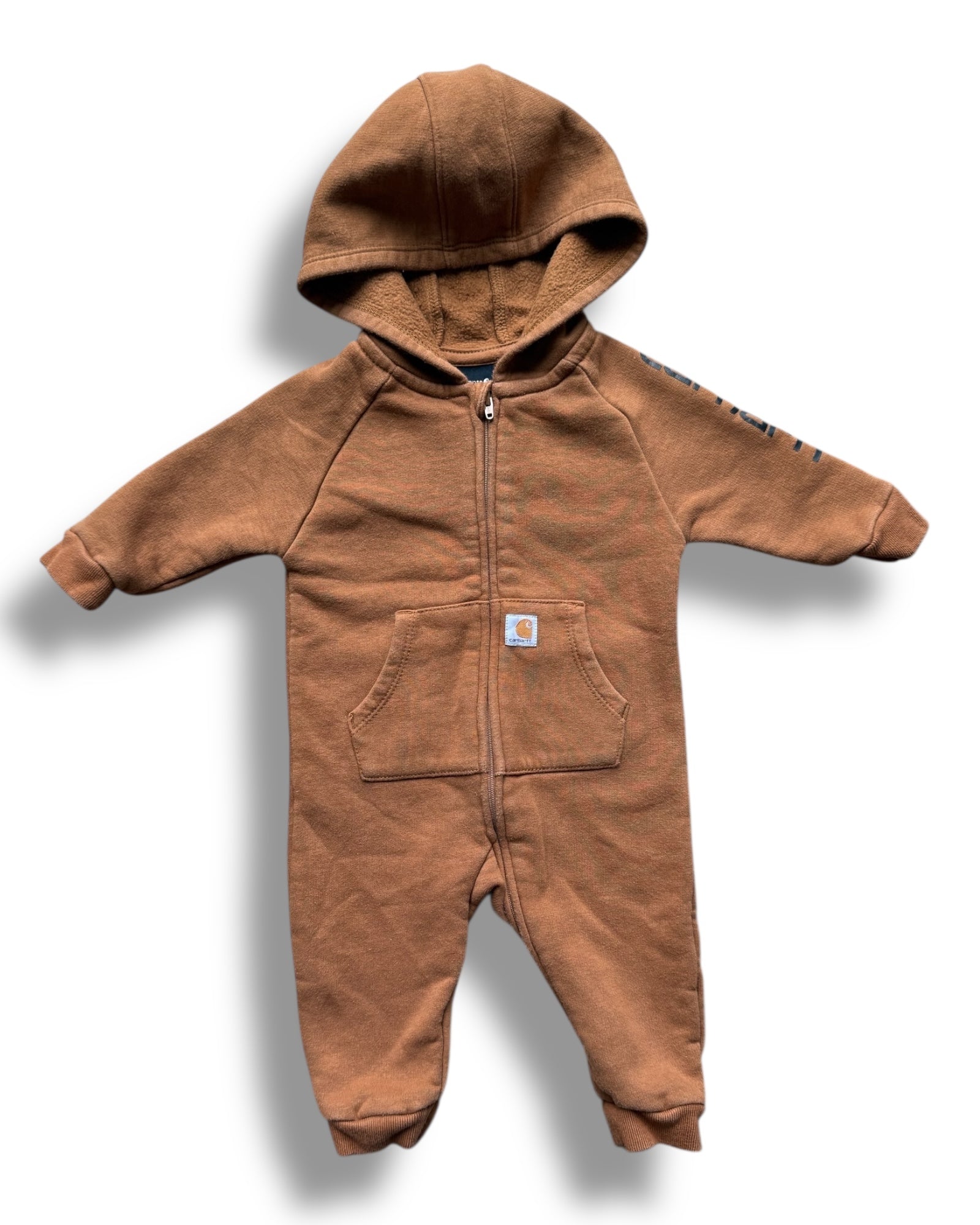 Keep your little one cosy and cool in this Carhartt baby all-in-one hooded tracksuit. Crafted from soft jersey fabric, it features a full zip for easy dressing and undressing, plus a comfy hood for extra warmth. The iconic Carhartt logo is printed on the arm, giving your mini a touch of workwear style. Perfect for playtime, nap time, or just looking adorably on-brand. Tan tones work with everything in their tiny wardrobe! Excellent vintage condition. Size 6mths.