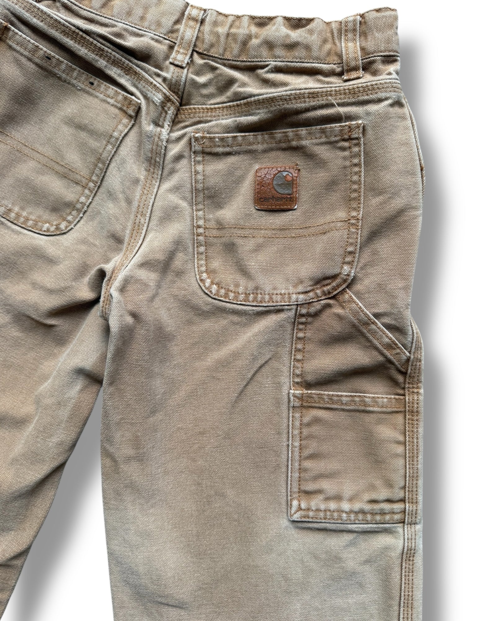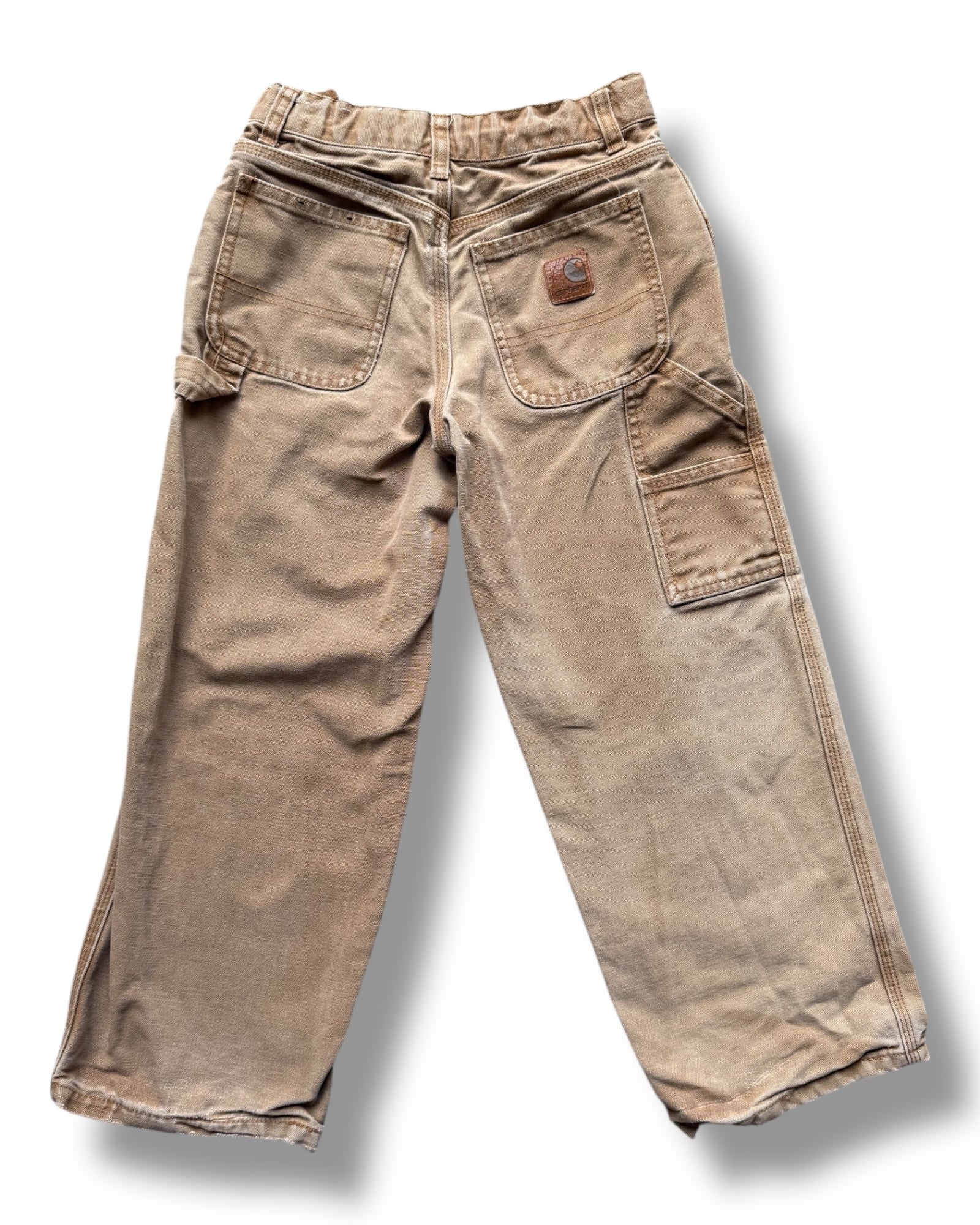 Built tough for little builders, these Carhartt kids carpenter jeans are ready for whatever adventure comes next. Featuring authentic carpenter pockets and reinforced seams, they're designed to handle playtime like a pro. In a perfectly faded sand colourway that will pair with everything in your kids wardrobe, the durable fabric is designed to keep up with active kids. Perfect for creating, climbing, and conquering the day in style. Great vintage condition. Size 8yrs.