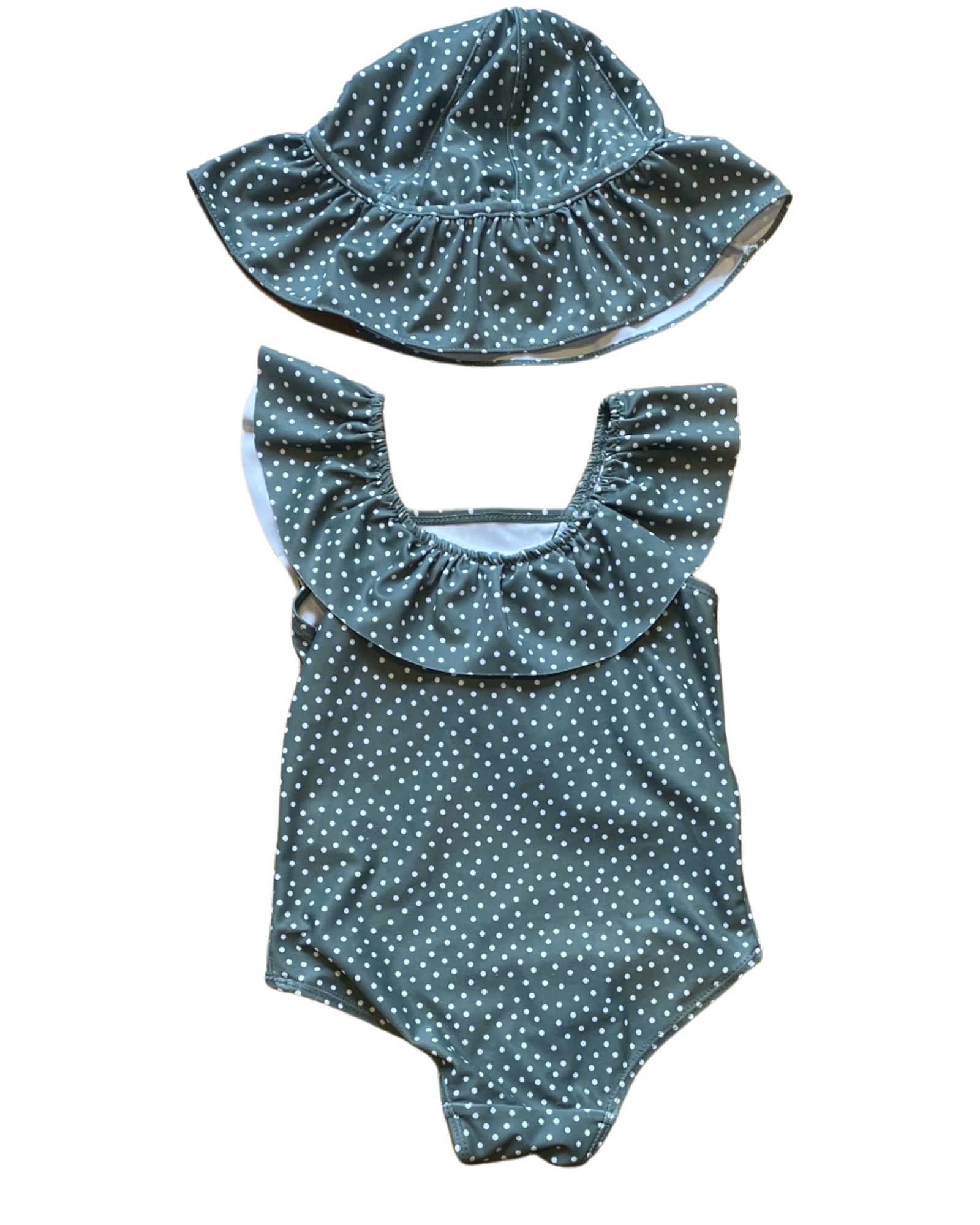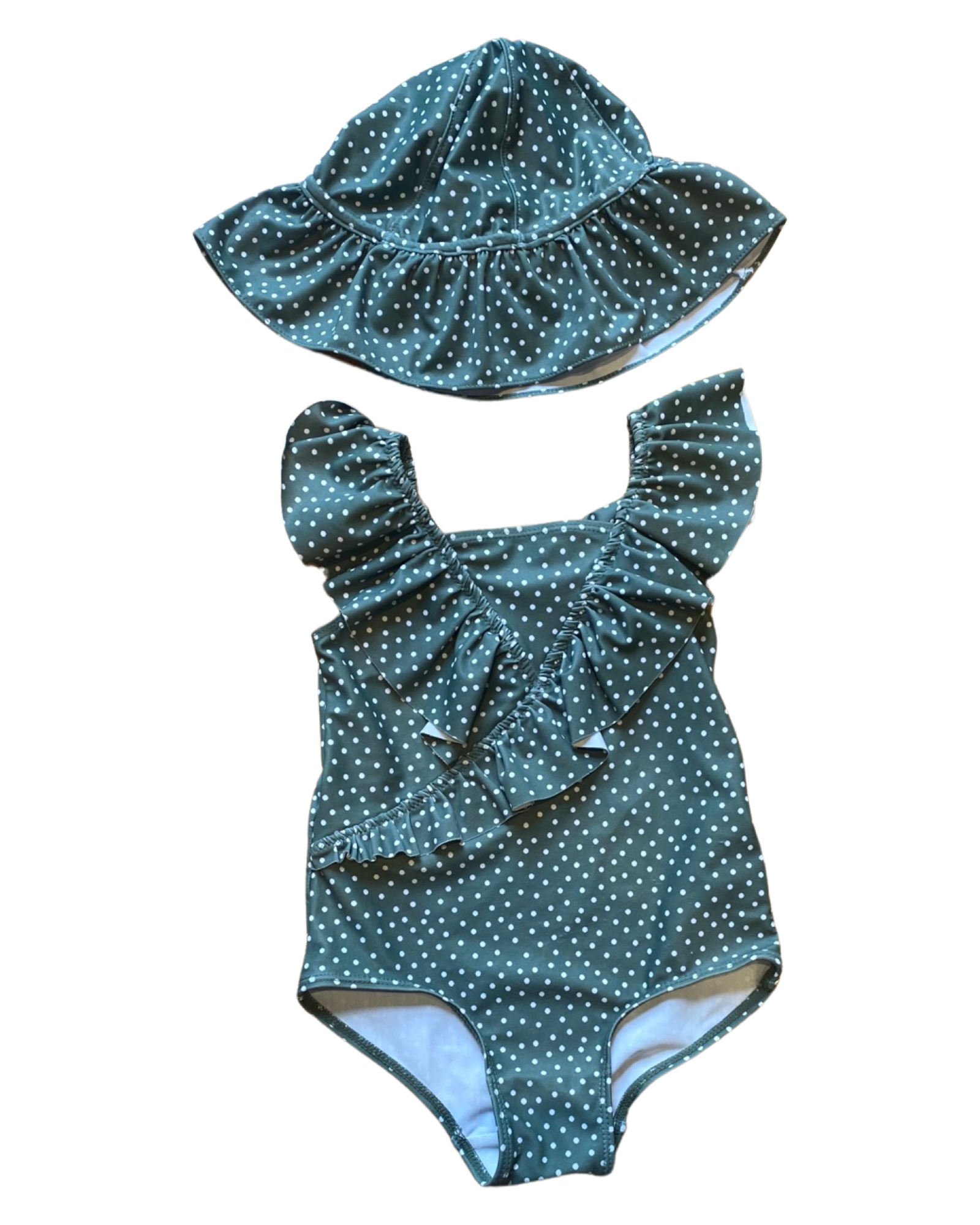 Cute swimsuit in sage green with all over white dotty print and frilled neckline. Comes with matching sun hat. Excellent preloved condition.