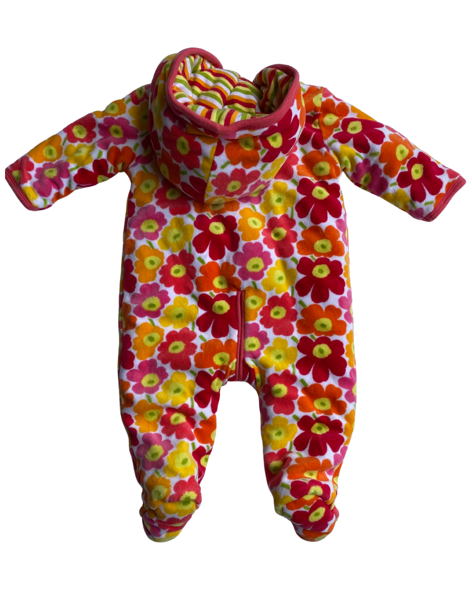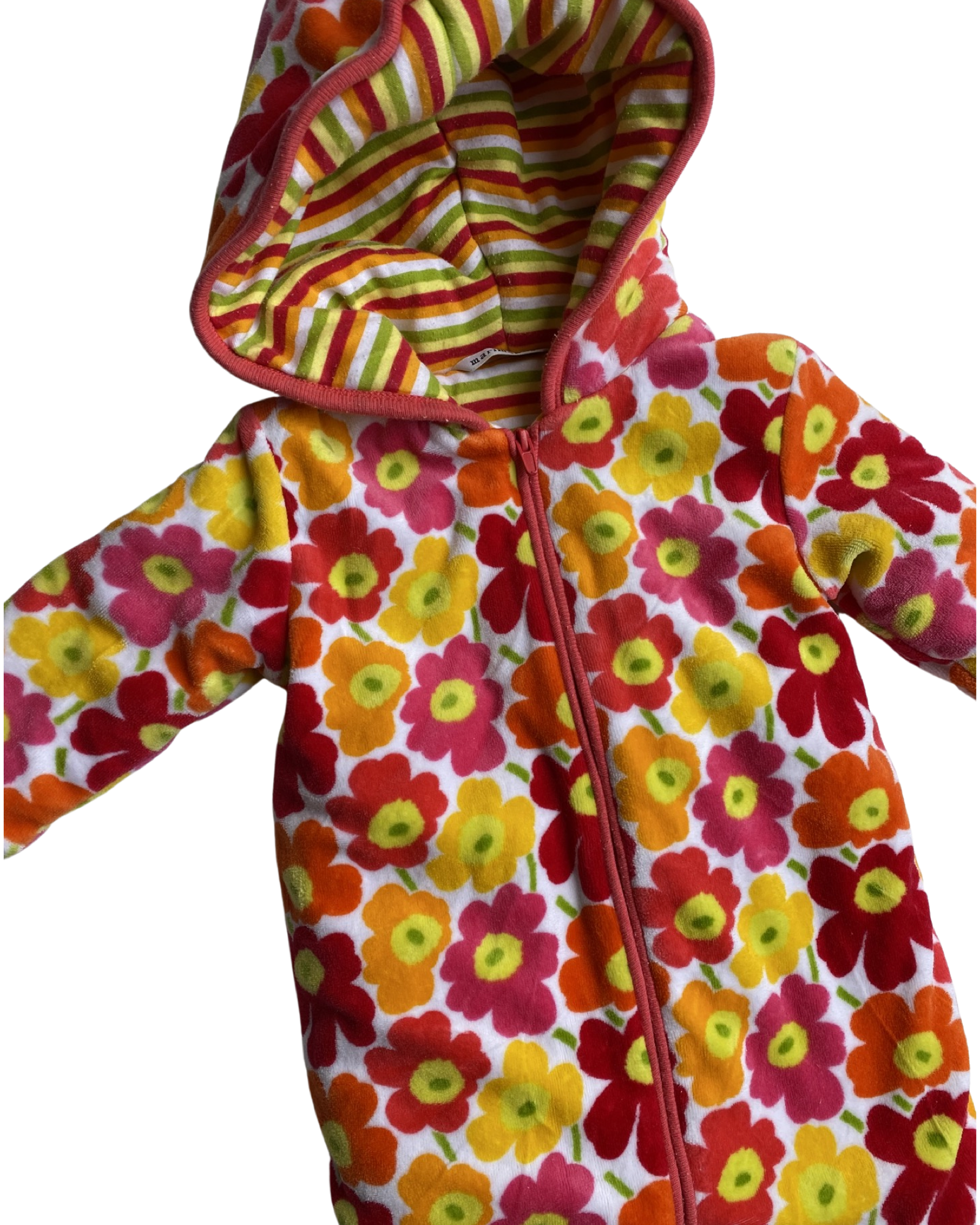 Gorgeous bright bold floral print velour pramsuit with contrast striped lining. Great preloved condition.