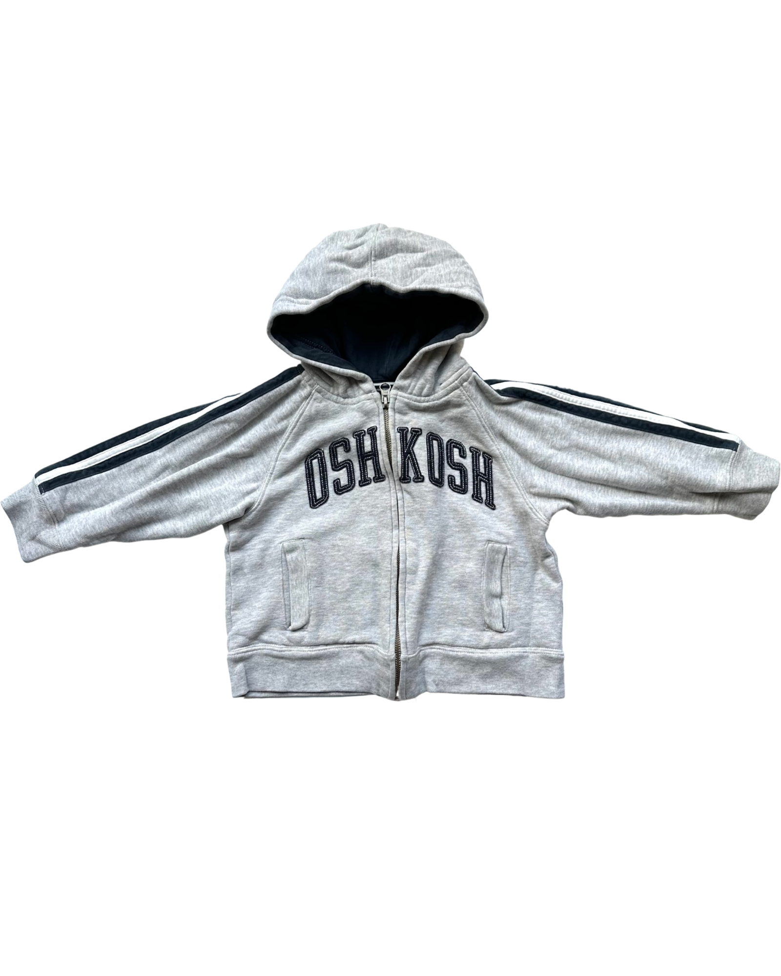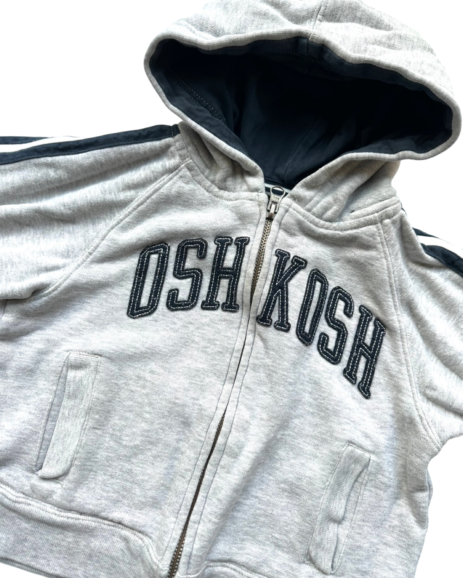 Grey marl zip up hoodie with Osh Kosh logo to front and navy striped sleeves. Great vintage condition.