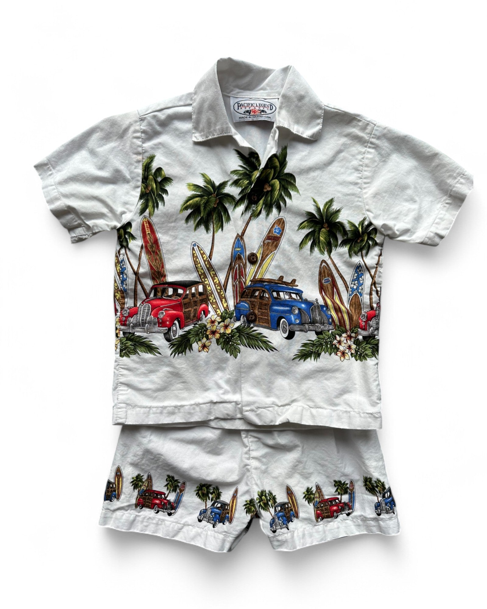 Upgrade to a stylish island vibe with this vintage Pacific Legend Hawaiian print 2 piece set. Made from soft cotton, the set features a button down shirt and comfortable elasticated waist shorts. Perfect for surf and beach lovers! Size 2 yrs.