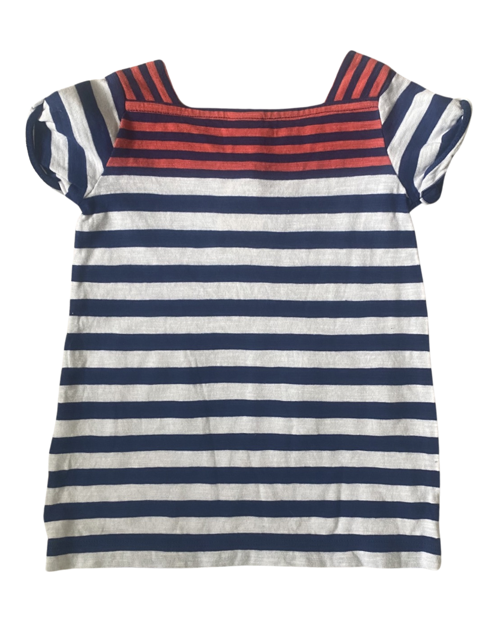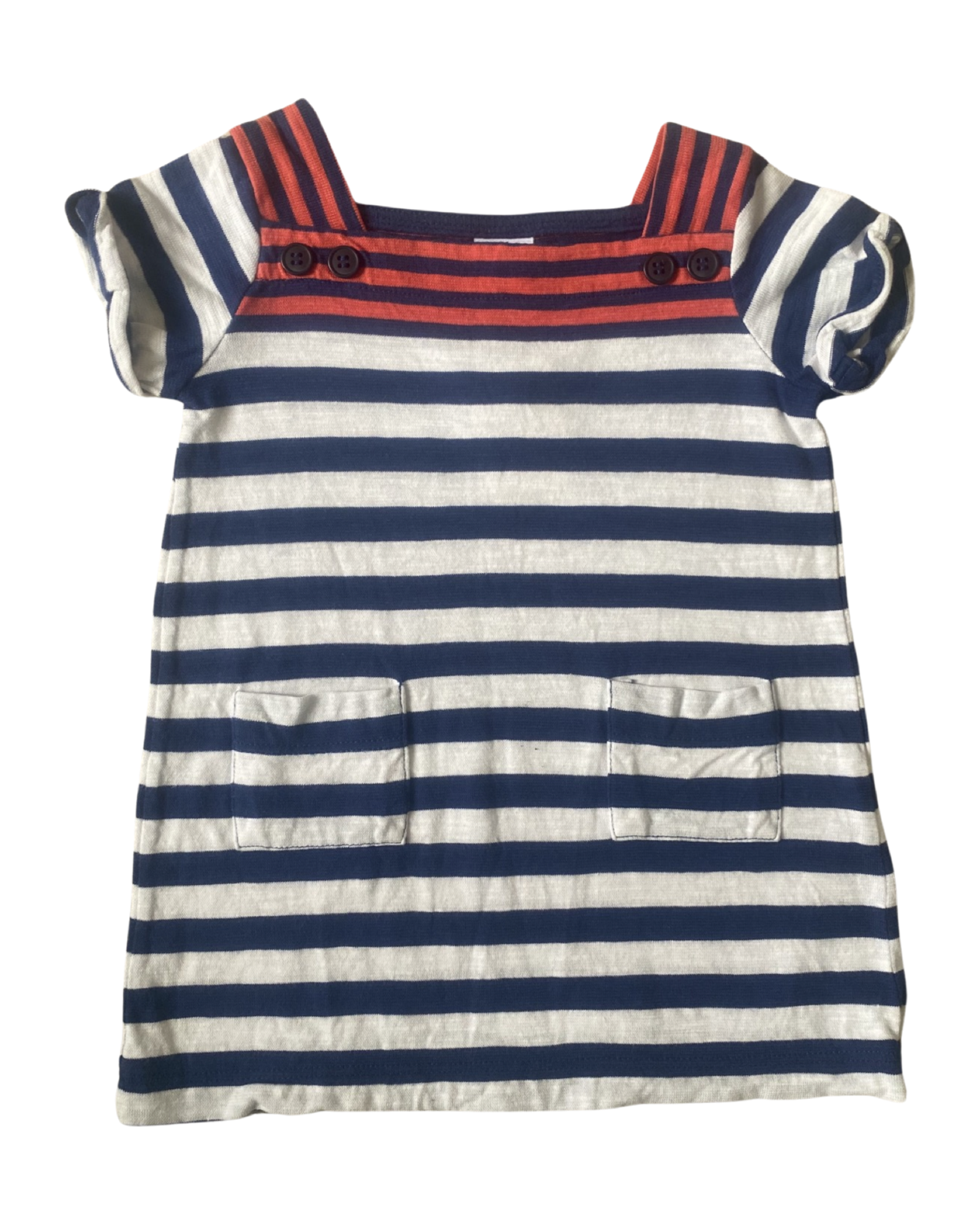 Cute nautical style lightweight cotton breton striped tunic dress with square neckline, patch pockets and button detailing. Excellent preloved condition.