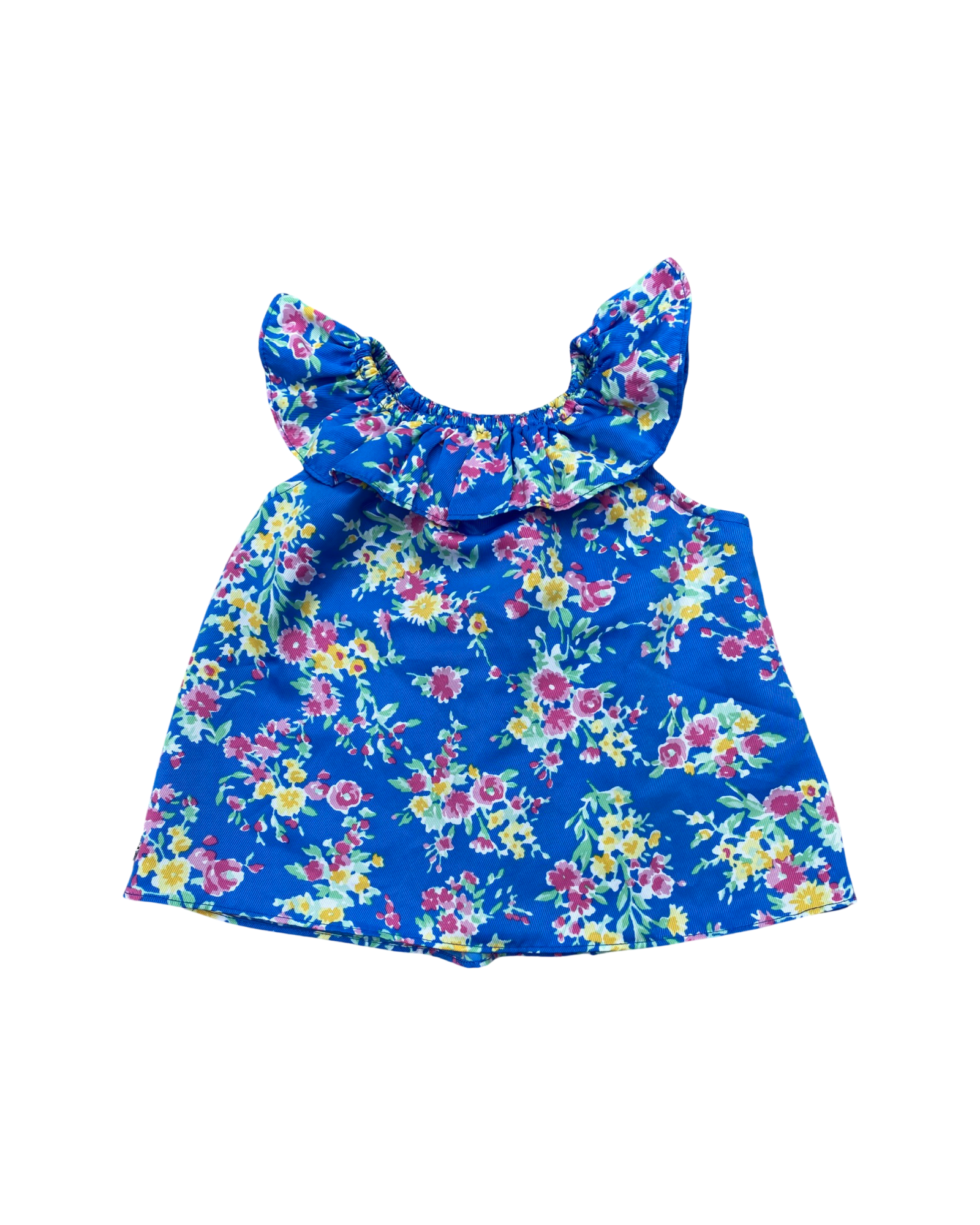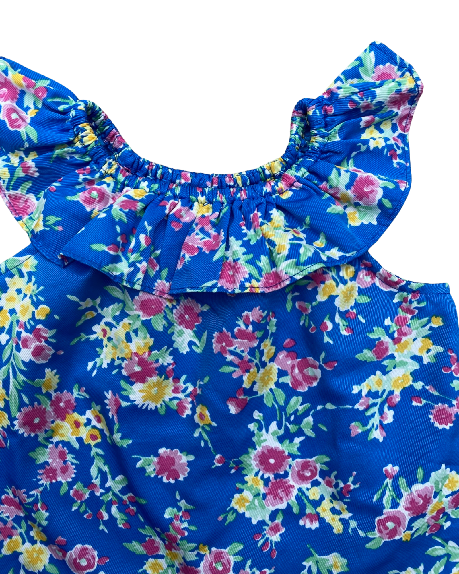 Lightweight summer blue floral baby dress with ruffled collar. Excellent preloved condition.