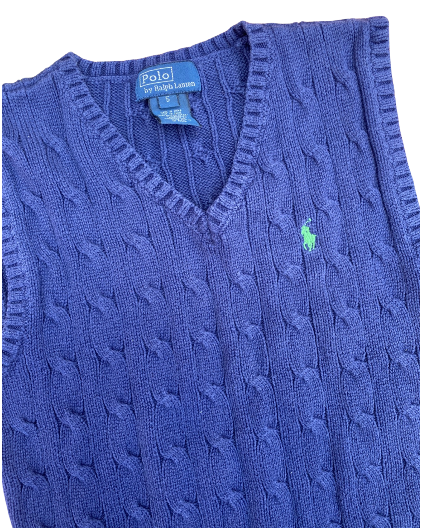 Classic v neck cable knit vest in navy, with polo emblem to chest. Excellent preloved condition.