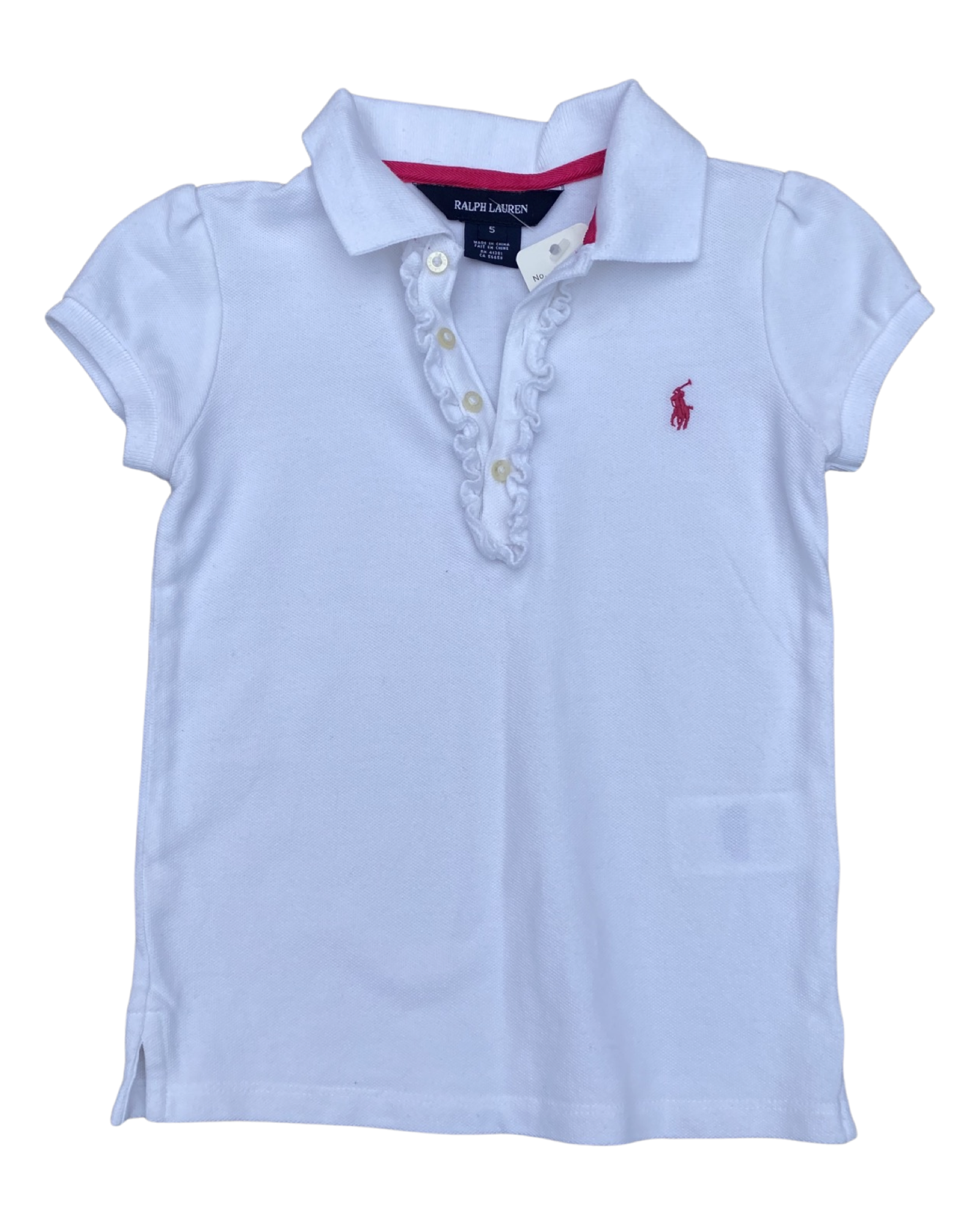 Classic style white cotton short sleeved collared polo shirt with ruffle trim to front buttons. Pink horse logo to chest. Excellent preloved condition.