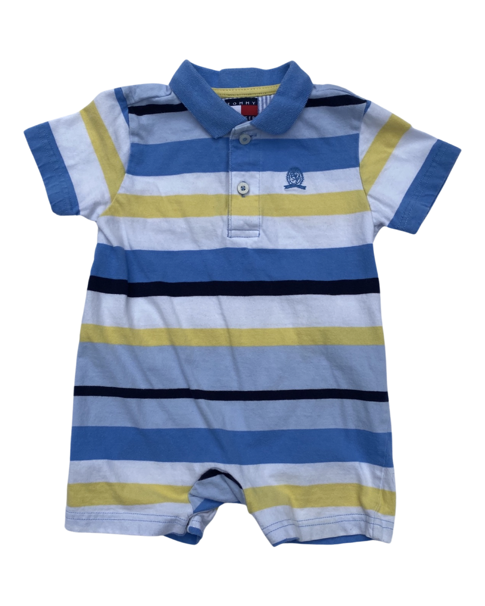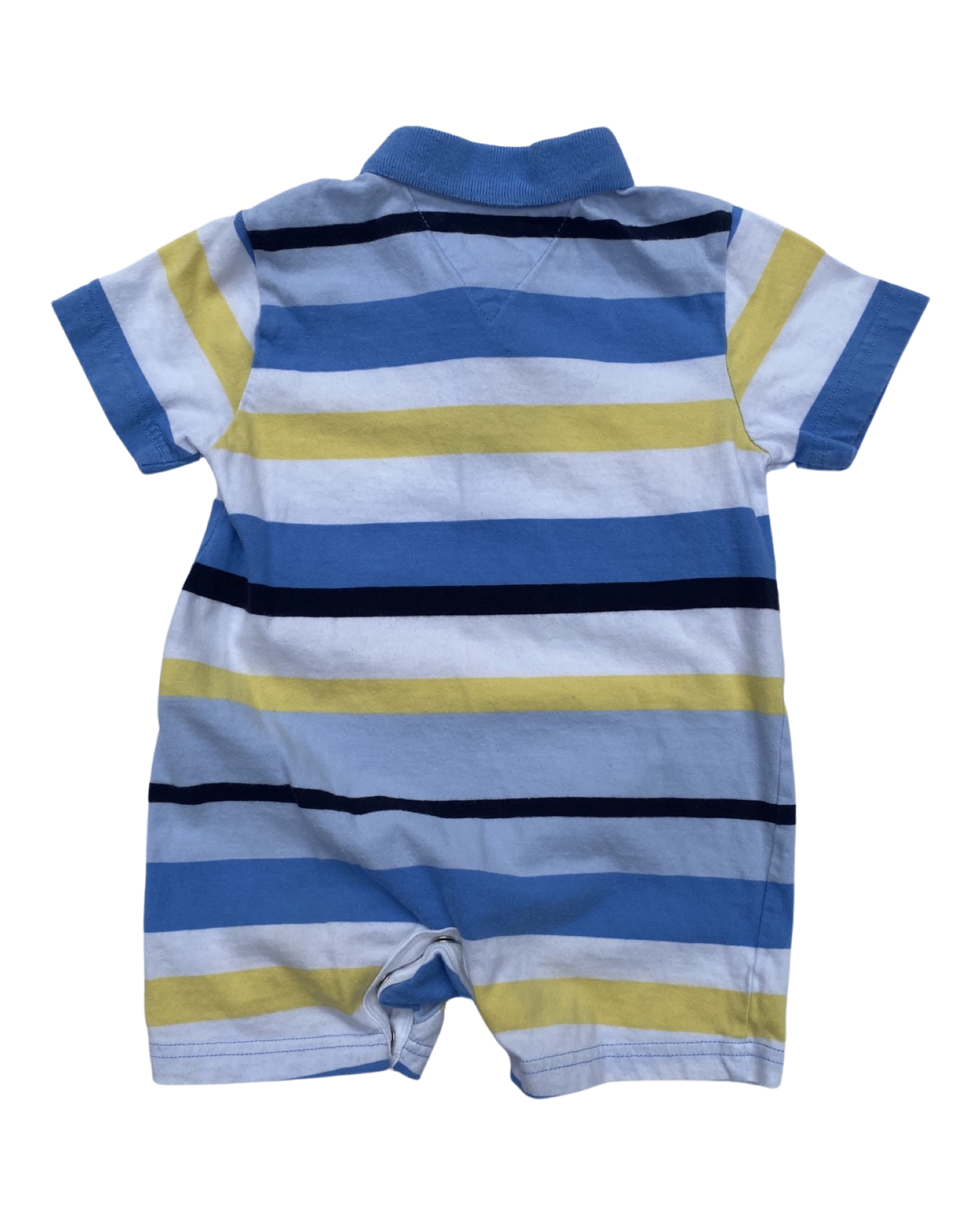Striped blue/yellow & white cotton polo style romper with button front and popper fastenings for easy nappy changes. Excellent preloved condition.