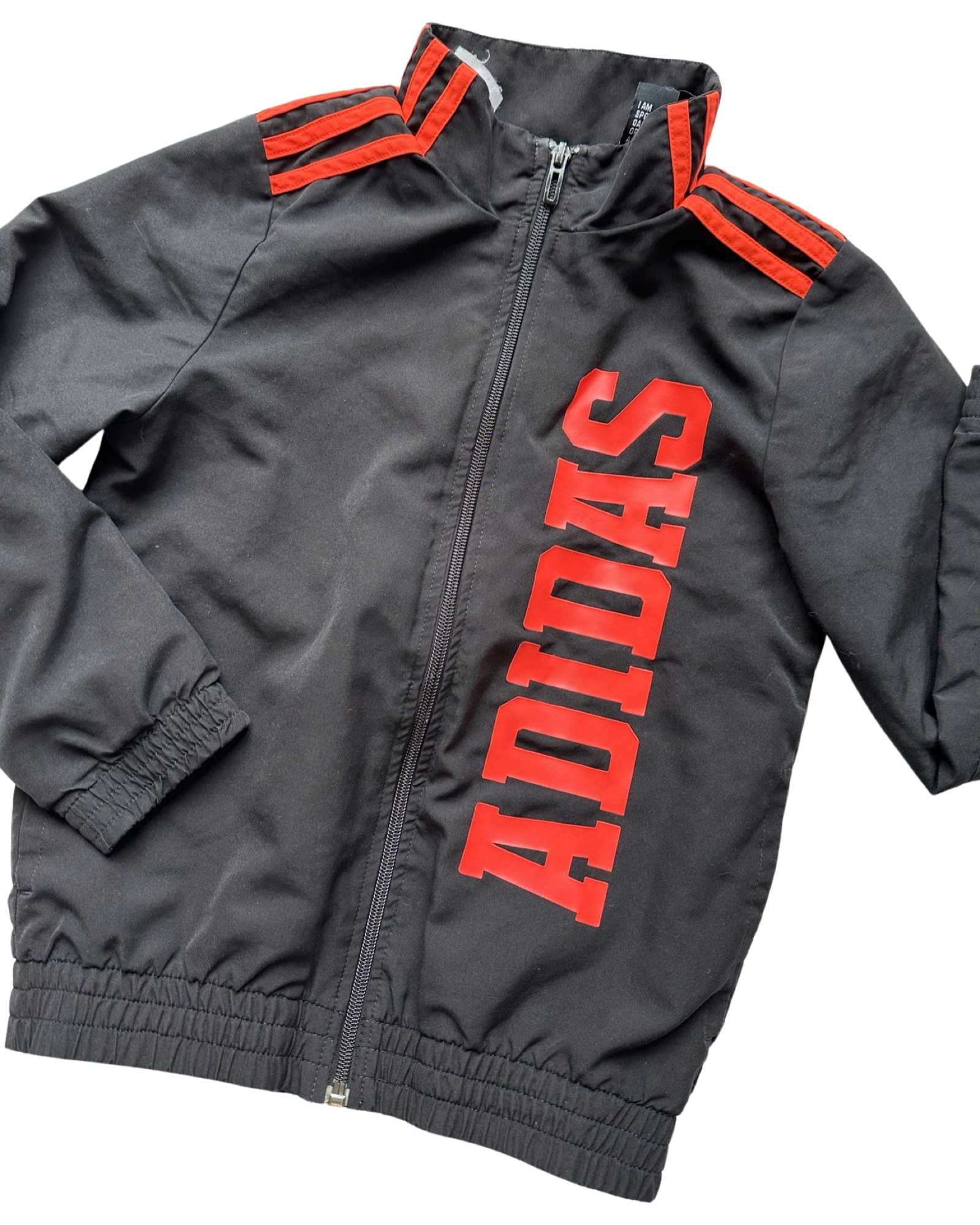 Zip up track jacket in black with red adidas logo print to front. Excellent condition.