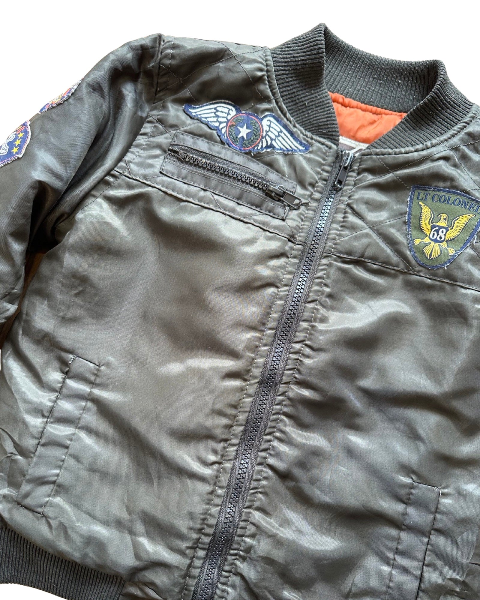 The trend of the season! 90s bomber in khaki with classic burnt orange lining and F-16 themed patches. Great vintage condition.