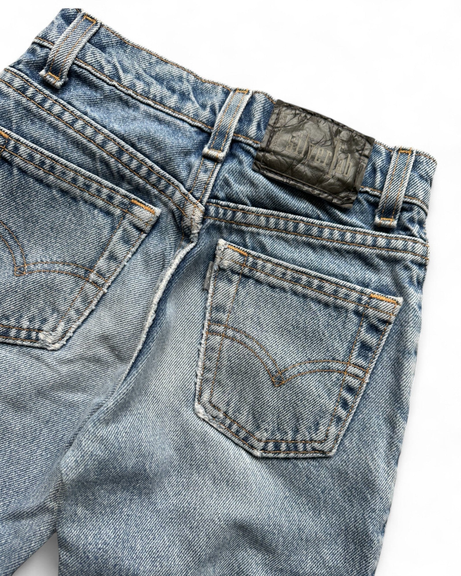 Vintage Levi's y2k jeans. These rare silver tab jeans boast a perfect vintage fade, flared leg & printed butterfly motifs to the lower legs giving them a one-of-a-kind Y2K look. Size 7T, Perfect for ages 6-7.