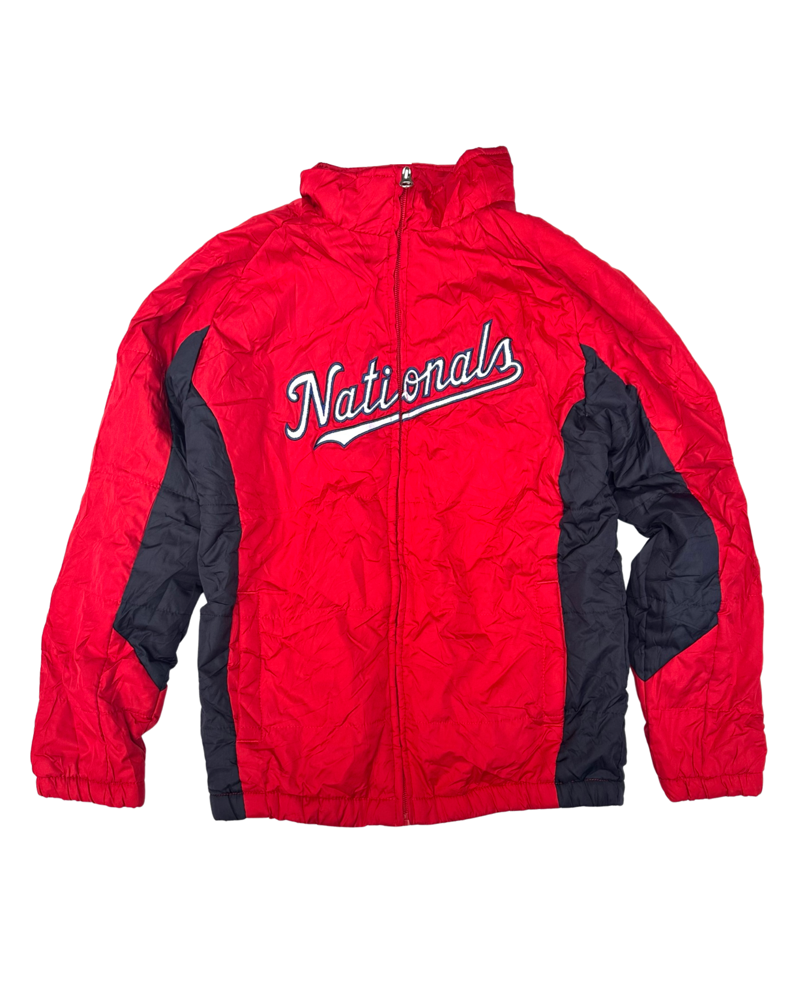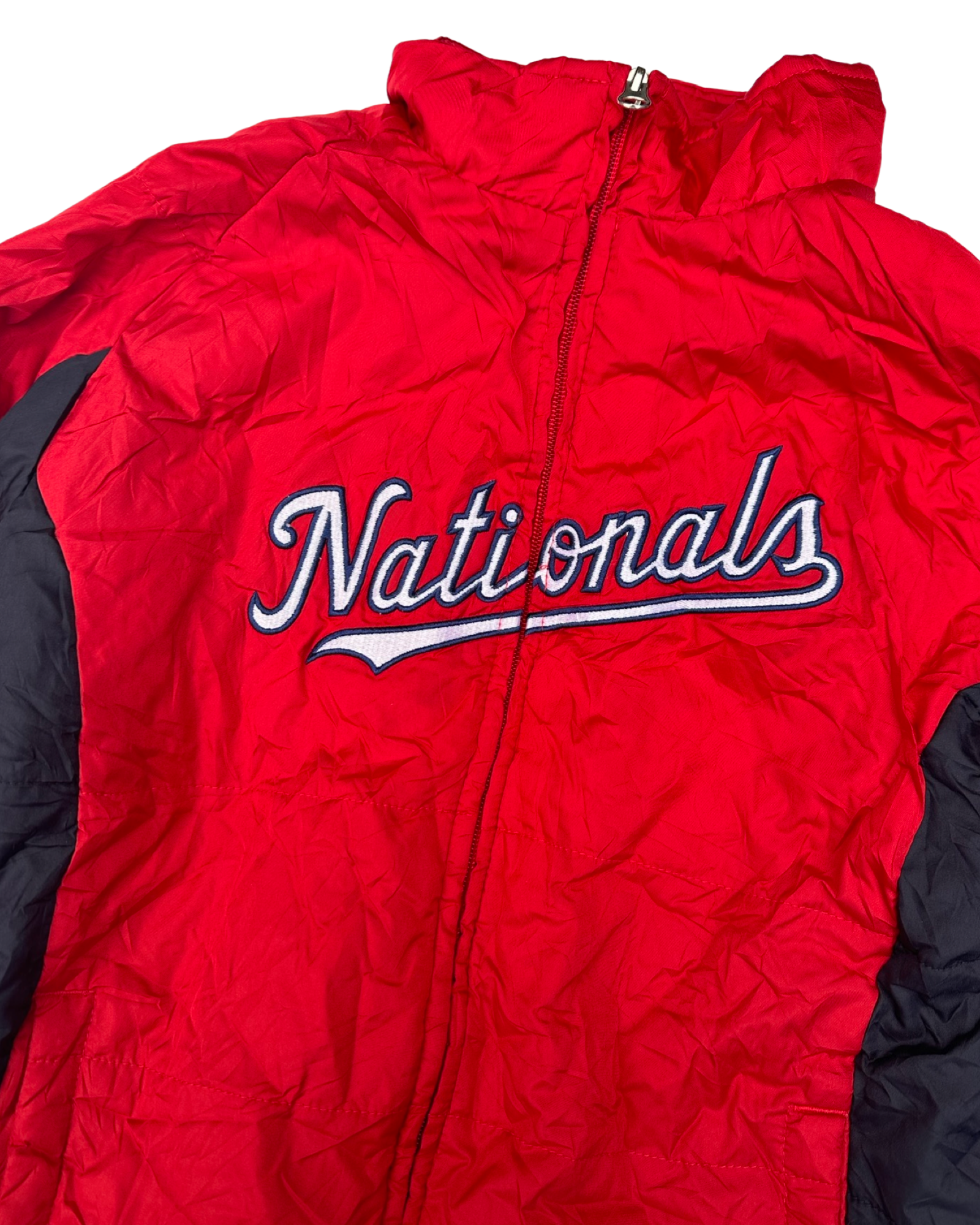 Red & navy Washington Nationals major league baseball team zip up padded jacket. Excellent vintage condition.