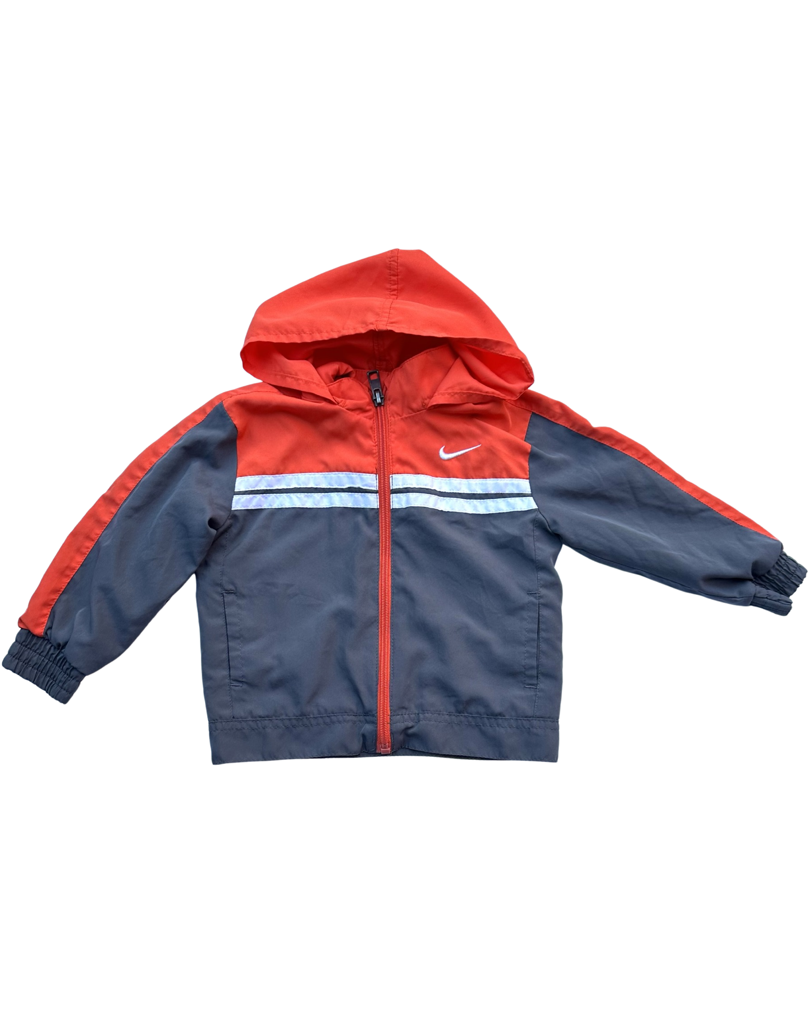 Lightweight grey windbreaker/track jacket with bright orange/white panel to upper, with rollaway hood. Excellent vintage condition.
