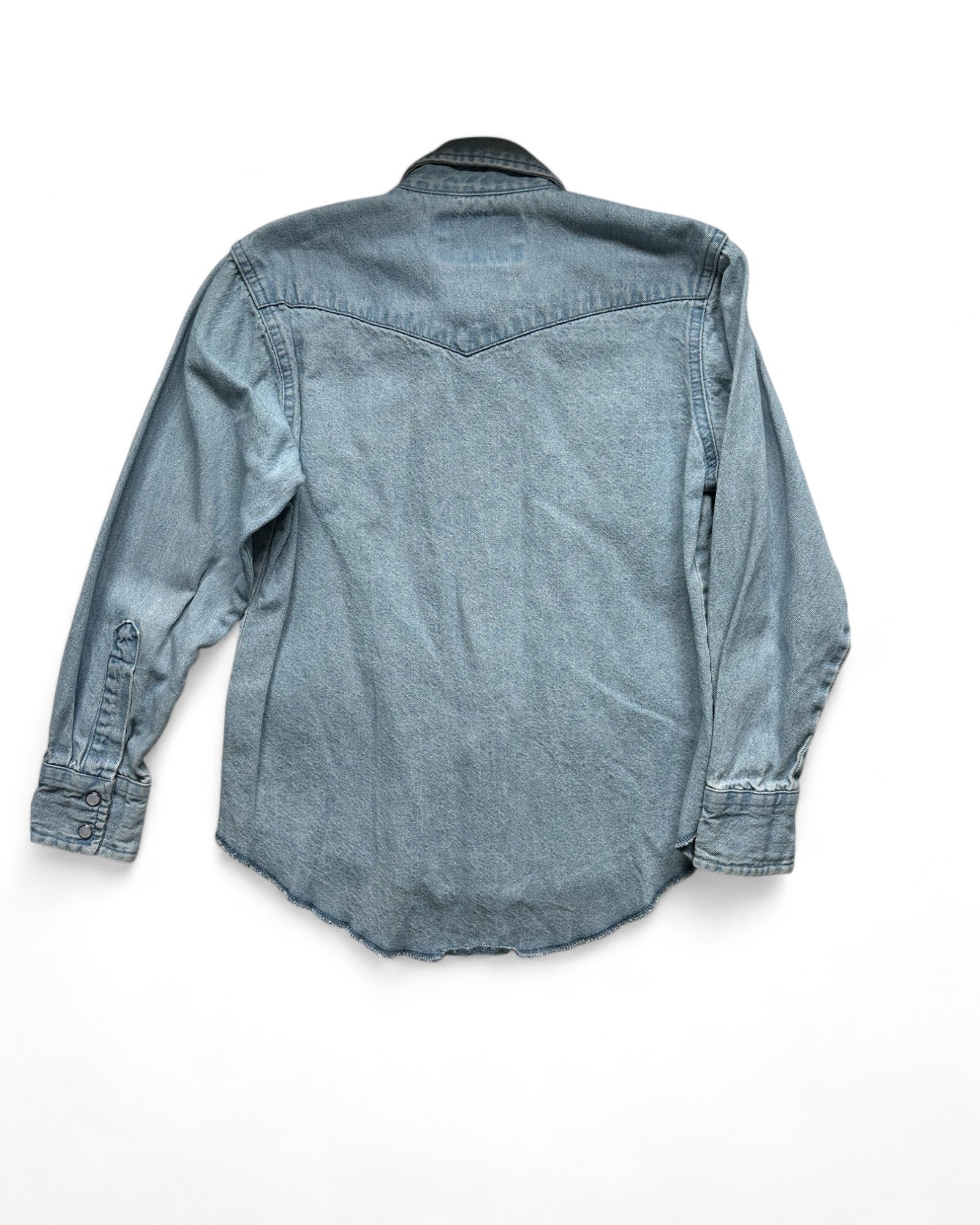 Channel some old-school cool with this Vintage Wrangler denim western shirt. With classic western styling and popper fastenings, your little one will be the most stylish kid on the playground. Available in size M youth, this shirt will quickly become a wardrobe favourite. Yeehaw!